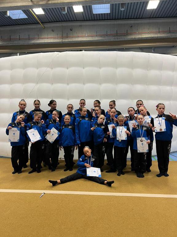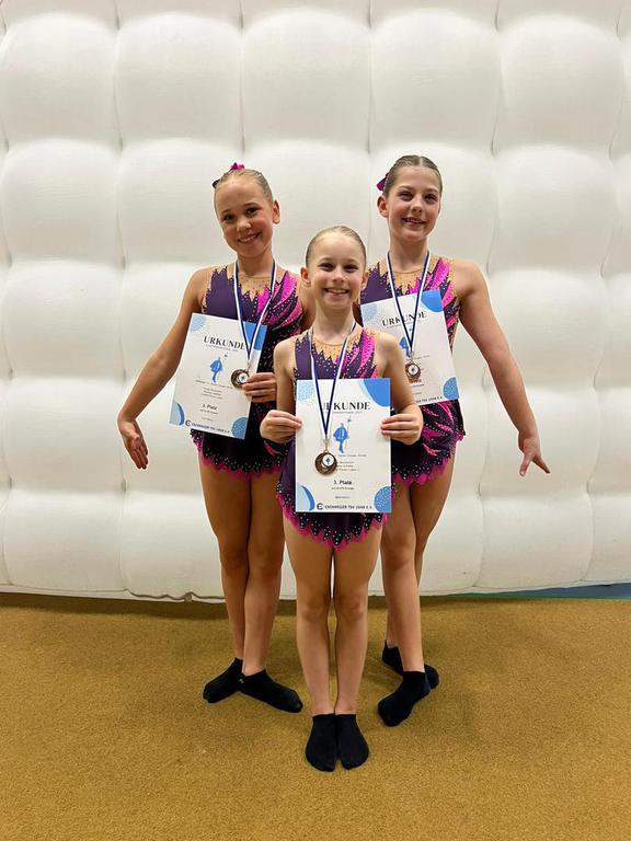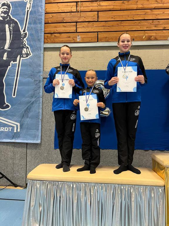 In der gleichen Altersklasse gingen Charlotte Epe, Johanna Kunkel, Valentina Emig sowie Fenja Wunderlich, Marlene Schäfer, Loriana Flores Lopez an den Start. Epe/ Kunkel/ Emig turnten eine saubere Kür und zeigten eine deutliche Steigerung zum letzten Wettkampf. Mit 21,250 Punkten erreichten sie einen guten 6. Platz. Wunderlich/ Schäfer/ Flores Lopez starteten erstmals in ihrer neuen Wettkampfkleidung. Souverän präsentierten sie ihre Kür und sicherten sich mit 23,370 Punkten die Bronze-Medaille.
